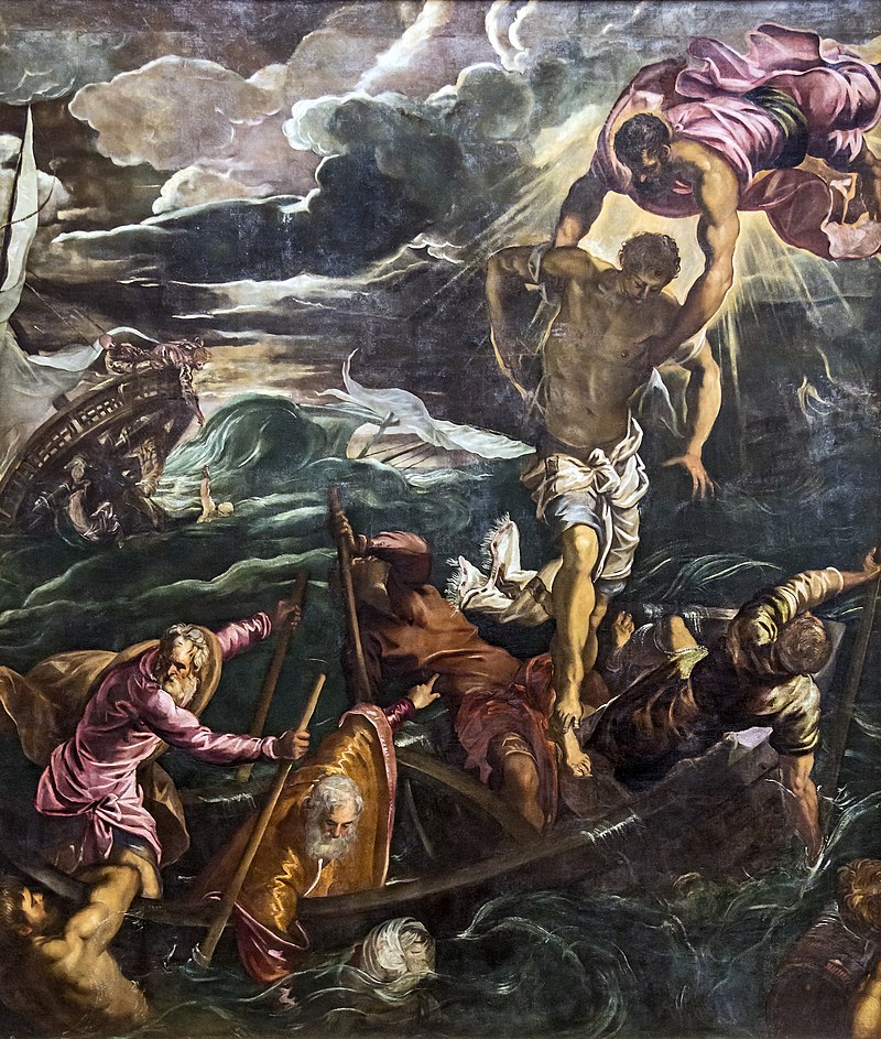 Na obrazie przedstawiającym wykradzenie ciała świętego Marka, weneccy kupcy z IX wieku – Buono da Malamocco i Rustico da Torcello, niosą podczas gwałtownej nawałnicy ciało świętego przez Aleksandrię i zapewne kierują się do portu. Przez niebo przetacza się burza, kupcy i ich pomocnicy, dźwigający cudownie zachowane ciało Ewangelisty, brną przez zalany wodą plac, natomiast mieszkańcy, namalowani jak bezcielesne widma, chowają się przed wiatrem w portykach pałaców, jeden z nich przewraca się gwałtownie i niemal „wypada” z obrazu. Pośrodku placu wiruje dziwny zapętlony cień, to zapewne stos, na którym miało być spalone ciało świętego. W wizji Tintoretta nie zabrakło elementów weneckich – plac wczesnośredniowiecznej  Aleksandrii przypomina Piazzettę z Biblioteca Marciana, projektowaną przez Jacopa Sansovina, a budowla w głębi jest daleką reminiscencją wieży zegarowej.