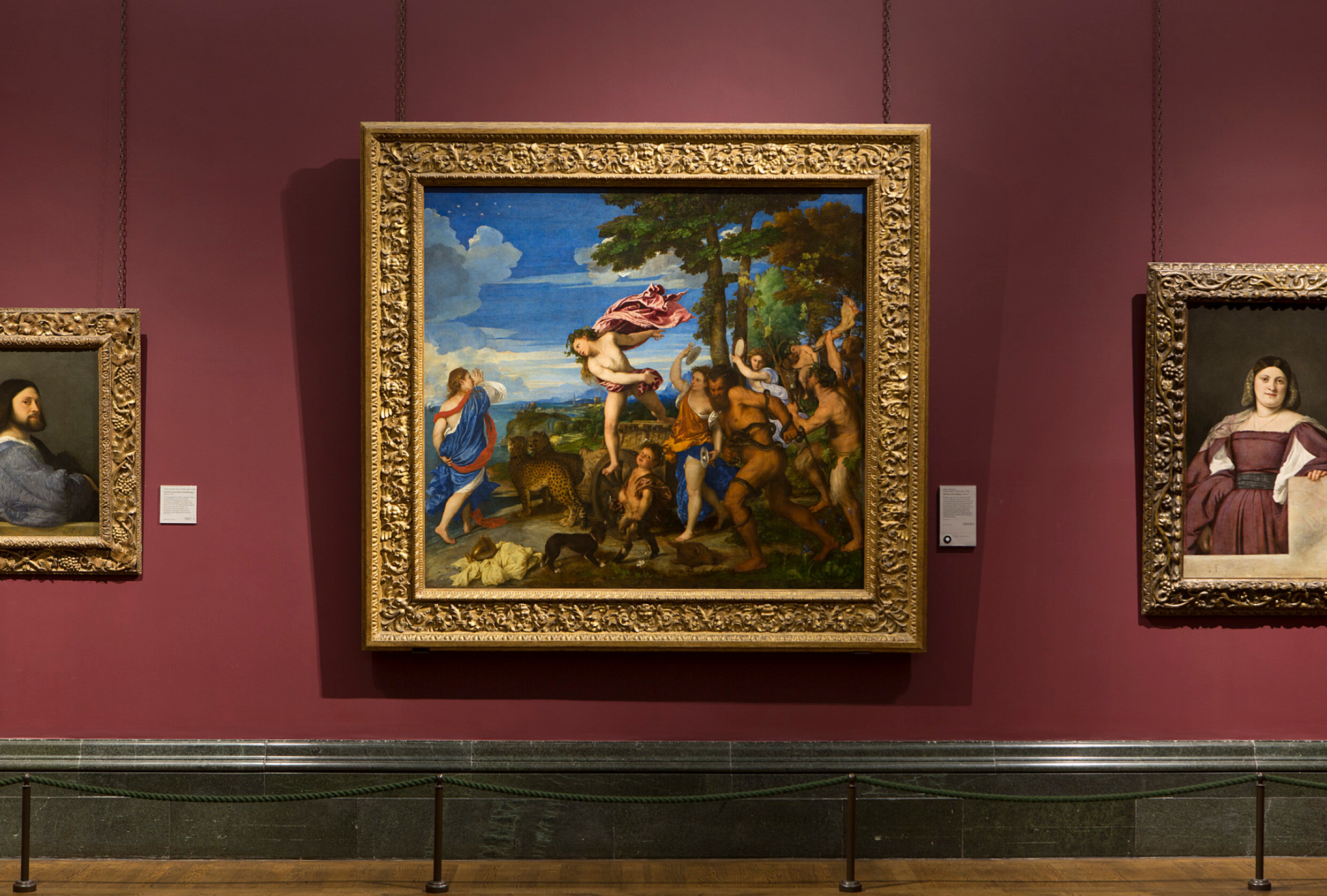 Obraz Tycjana „Bachus i Ariadna” sfotografowany podczas dwóch różnych sesji, zapewne przy odmiennym świetle. Zmianę tonacji widać nie tylko w kolorach na samym obrazie, ale również na tkaninie pokrywającej ściany galerii.