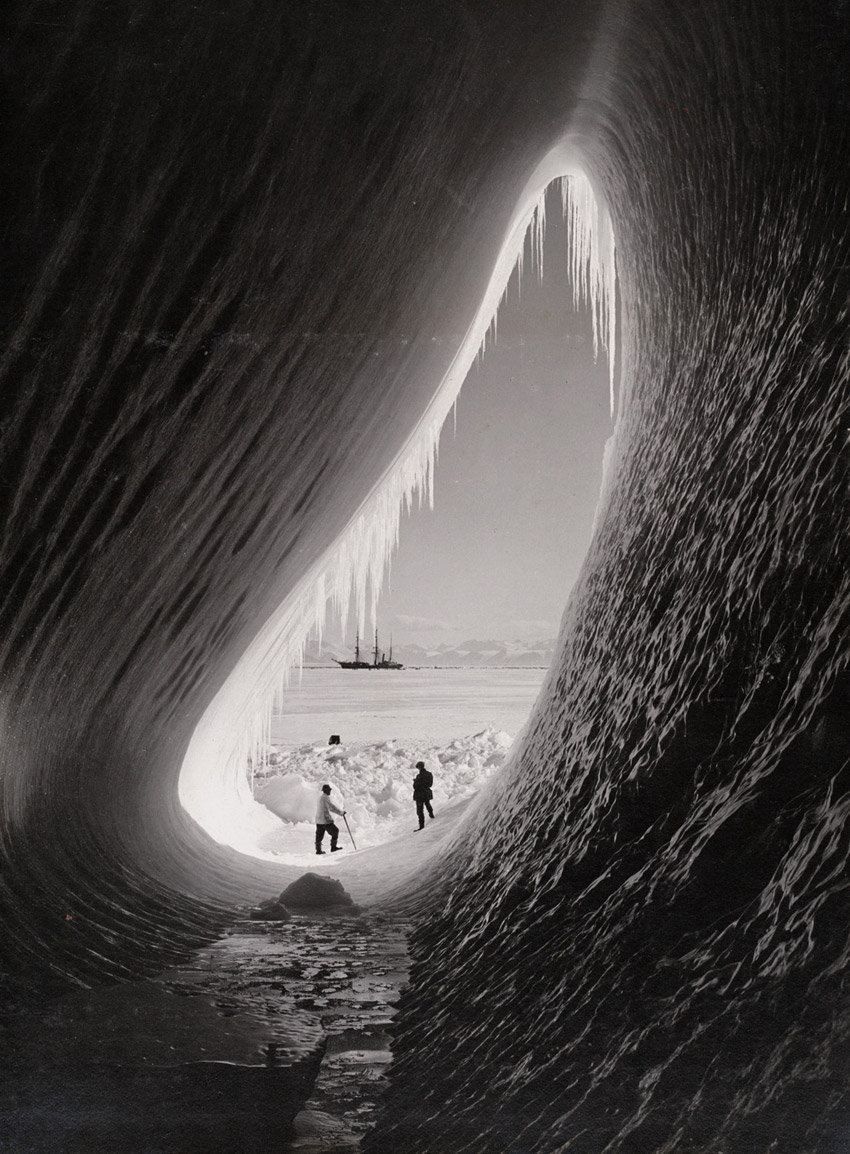 Najbardziej znane zdjęcia z heroicznej ery wypraw na Antarktykę z 1912 roku, fotografia Herberta Pontinga zrobiona z jaskini w górze lodowej; w oddali statek Roberta Falcona Scotta – Terra Nova
