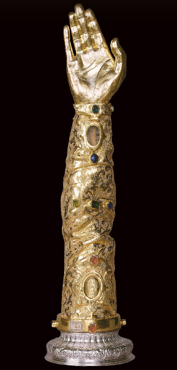 na ilustracjach (od lewej): relikwiarz ciernia z korony cierniowej Chrystusa (British Museum); relikwiarz św. Katarzyny ze Sieny (kościół dominikanów, Siena); relikwiarz św. Jana Chryzostoma (Museu de São Roque, Portugalia), relikwiarz św. Błażeja (Musée Provincial des Arts Anciens du Namurois w Namur)