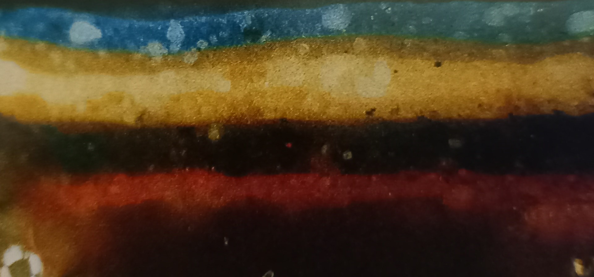 Nicolò Renieri (1591–1667), „Scena karnawałowa”, Muzeum Pałacu Jana III Sobieskiego w Wilanowie; próbki pobrane z niebieskiej sukienki i żółtego pióra z widocznymi grubo utartymi drobinkami mączki marmurowej.